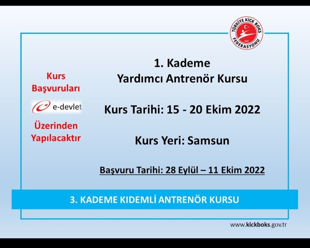 Federasyonumuzun 2022 yılı Faaliyet Programında yer alan 1. Kademe Yardımcı Antrenör Kursu 15-20 Ekim 2022 tarihleri arasında Samsun Gençlik ve Spor İl Müdürlüğü Atatürk Spor Salonunda (Samsun/Canik) yapılacaktır. Kurs için kayıtlar e-devlet üzerinden yapılacak olup kayıt tarihleri 28 Eylül – 11 Ekim 2022’ dir. Başvurular e-devlette yer alan Spor Bilgi Sistemi modülü içerisinde “Kurs Başvurusu” olarak yapılacaktır. Kursta istenilen belgeler başvuru sırasında sisteme yüklenecektir.