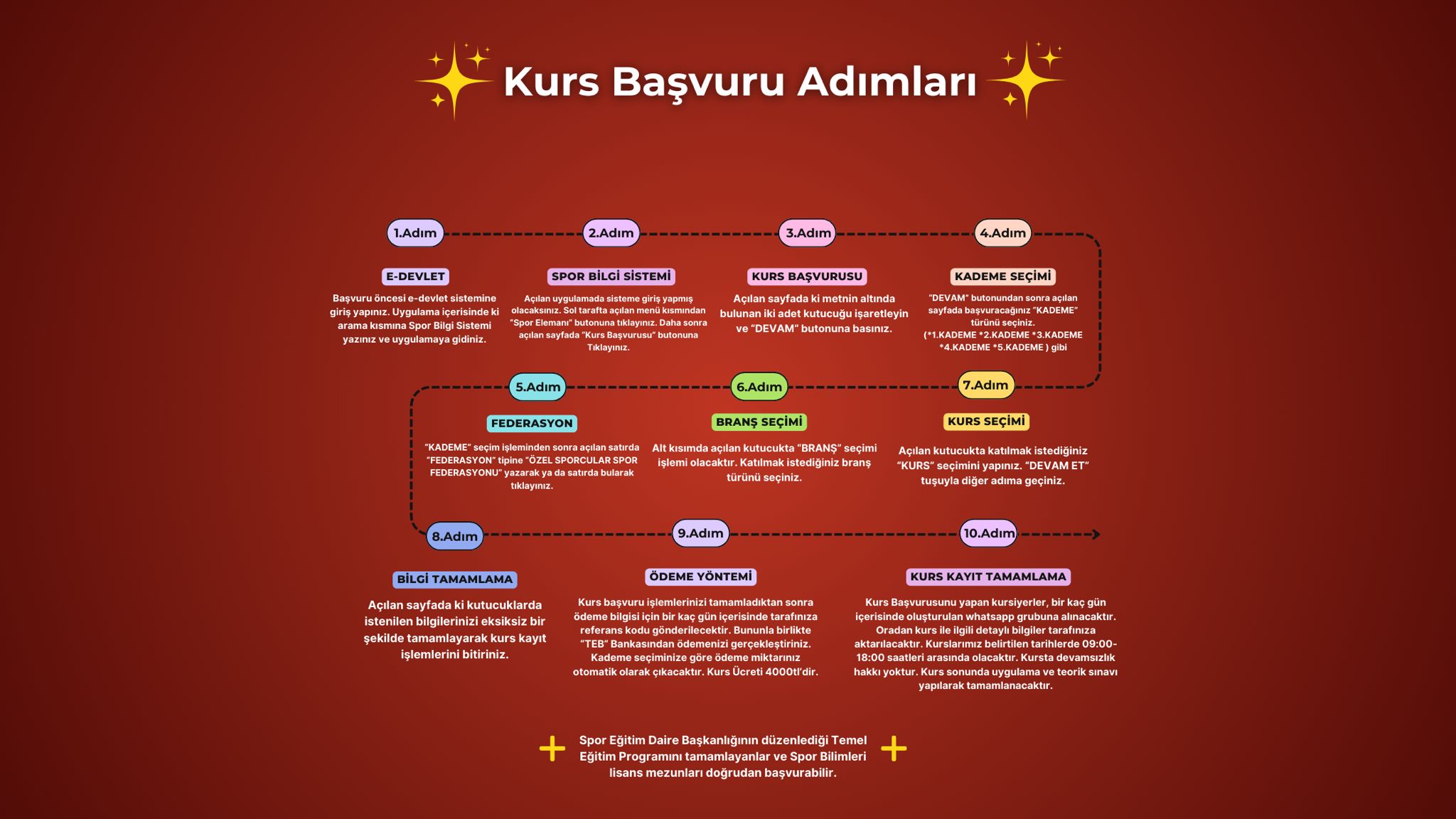 Spor Eğitimi ve Araştırmaları Daire Başkanlığının her yıl düzenlediği Temel Eğitim Programına katılıp başarılı olanlar kursa başvuru yapabilir.