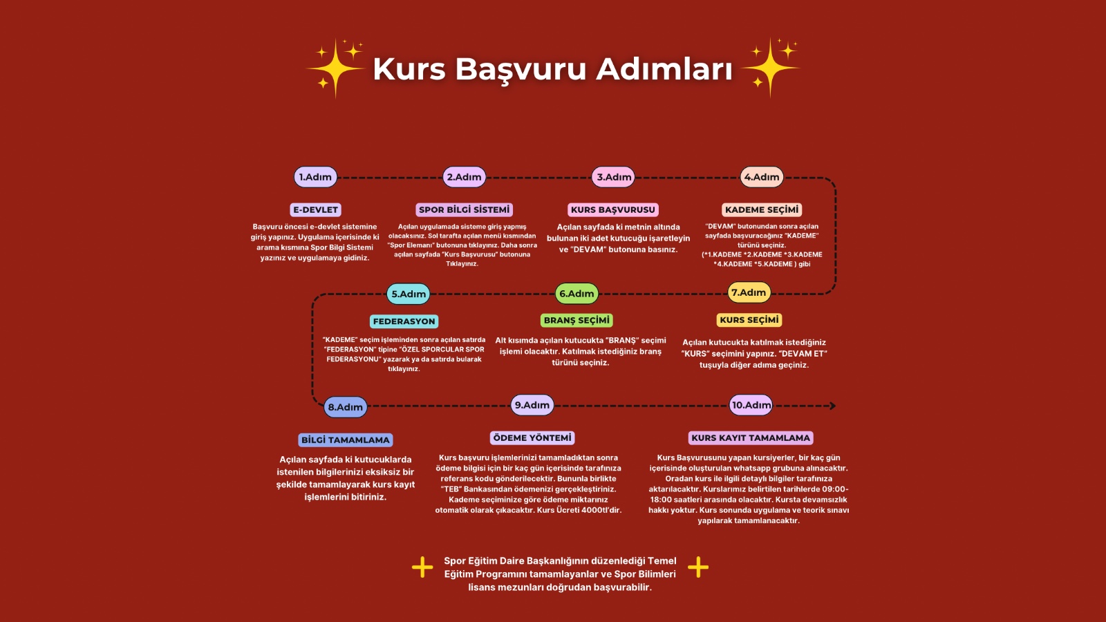Spor Eğitimi ve Araştırmaları Daire Başkanlığının her yıl düzenlediği Temel Eğitim Programına katılıp başarılı olanlar kursa başvuru yapabilir.