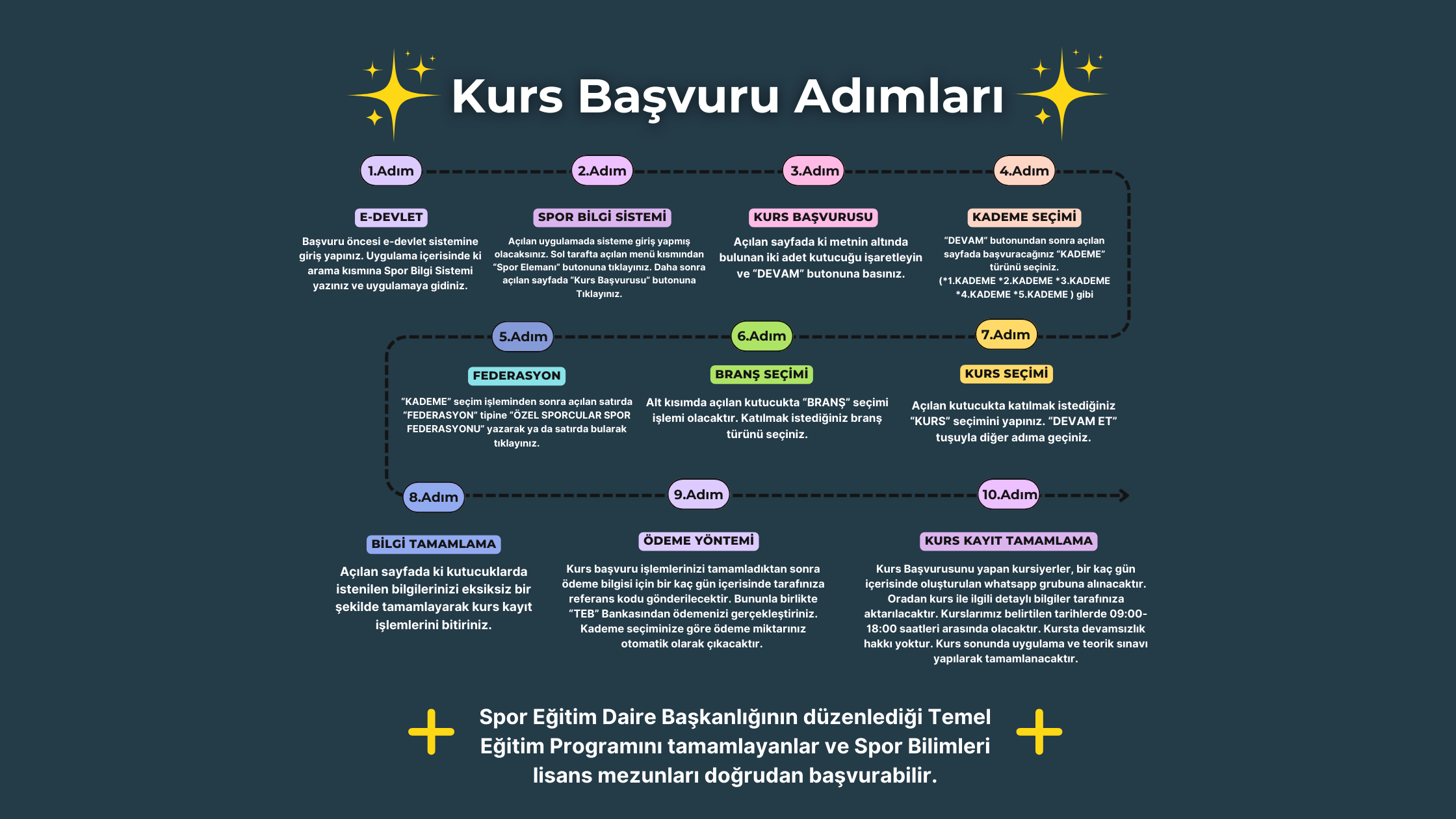 Üniversitelerin Spor Bilimleri alanında lisans eğitimi veren fakülte veya yüksekokullarından mezun olanlar Temel Eğitimden muaf olarak kursa başvuru yapabilirler.