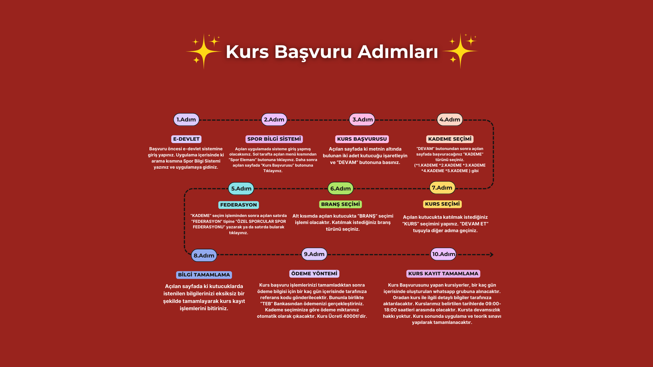 Referans numarası alan ve Referans Numarası veya TC Kimlik Numarası ile TEB Bankası Gişesinden-ATM veya Cepte Tep uygulaması aracılığı ile ‘‘Fatura Ödeme ekranından GSB ve Federasyon ödemelerine” ücret yatıranlar Kursa katılabilecektir.