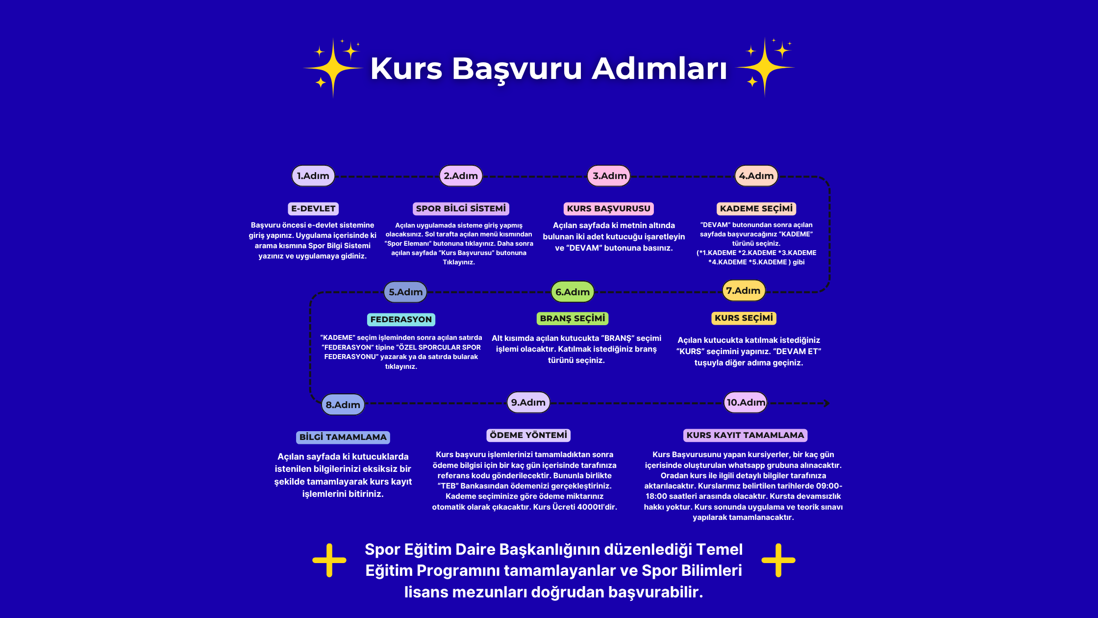 Spor Eğitimi ve Araştırmaları Daire Başkanlığının her yıl düzenlediği Temel Eğitim Programına katılıp başarılı olanlar kursa başvuru yapabilir.