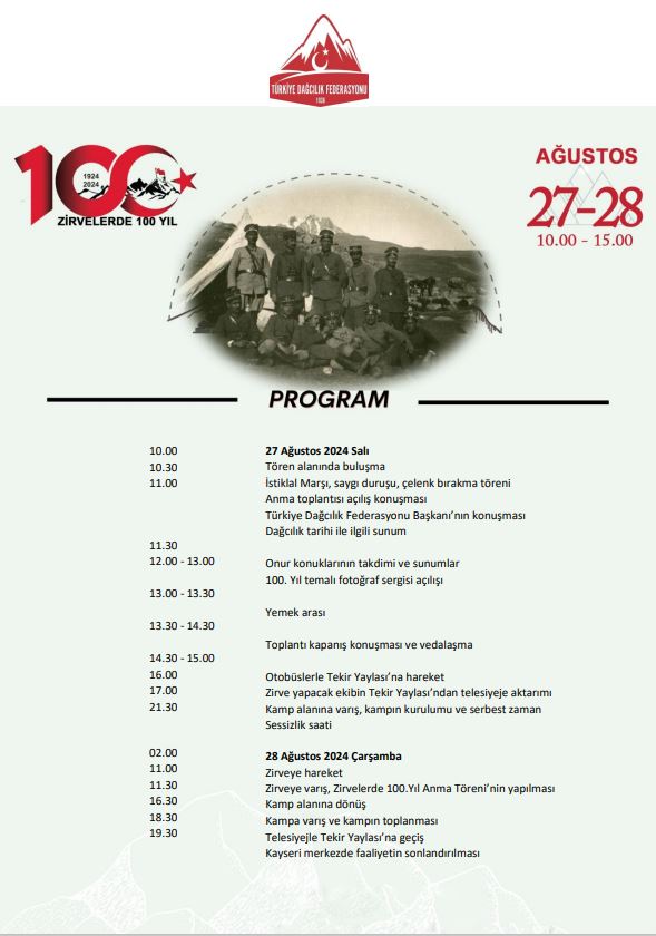 Ülkemizde, Türk Dağcılar tarafından yapılan ilk zirve tırmanışının 100. yıldönümü nedeniyle gerçekleştireceğimiz “Zirvelerde 100 Yıl: İlk Tırmanışın Hikayesi Erciyes Dağı Tırmanışı” katılımcı listesi belli olmuştur.